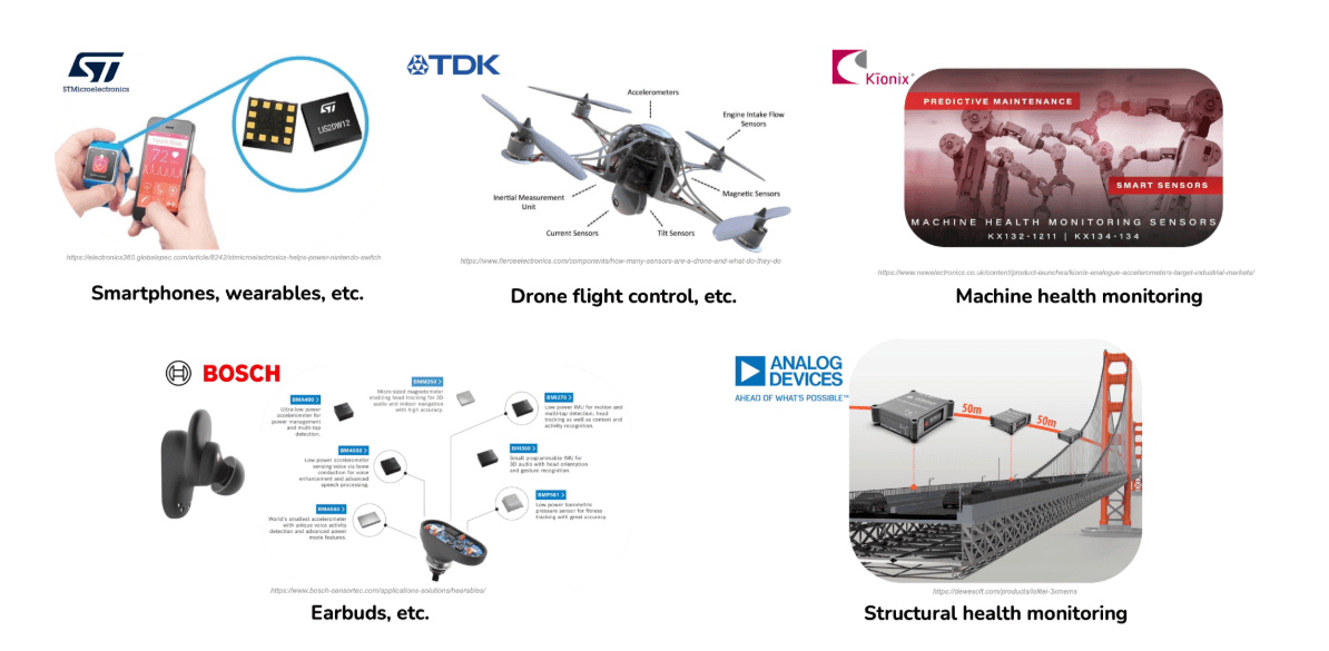 This scaling challenge is exactly where my work comes in. I am currently developing a new network of sensors based on MEMS (Micro-Electro- Mechanical Systems) technology. You might not be familiar with the name, but MEMS accelerometers have been part of our everyday lives for decades. You can find these tiny devices inside your smartphone, your wireless earbuds, commercial drones, and even systems monitoring the health of machines and bridges. Figure 2 shows the top five manufacturers of MEMS accelerometers and what their flagship products are used for.