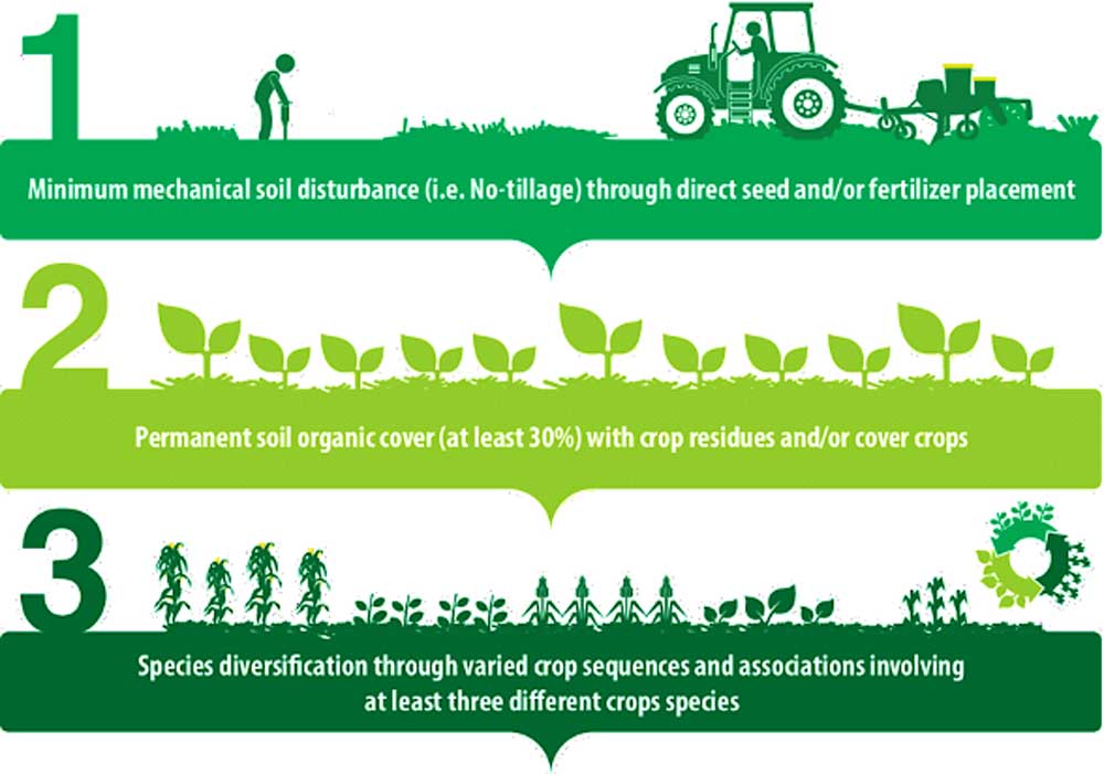 Conservation Agriculture (CA) is an agricultural system designed to manage agroecosystems for improved and sustained productivity by conserving and enhancing soil quality and biota. Despite widespread promotion and adoption in various regions globally, the effectiveness and sustainability of CA remain topics of ongoing debate and investigation. The three principles of Conservation Agriculture are shown below in Figure 2.