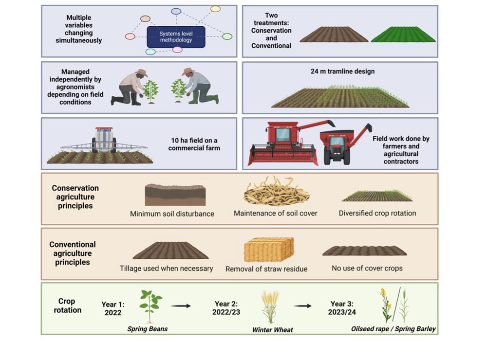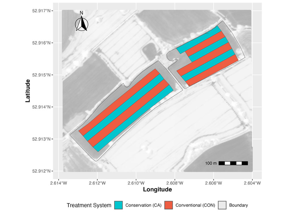 The experiment that I started for my PhD has now been running for 5 years and is ongoing, was set up at a 9.5 ha experimental site near Whitchurch, Shropshire (UK) on Shavington and Cloverley Estate. It comprises a systematic 24 m multi-strip blocked design of CA and conventional crop production (CON); each system is independently managed by agronomists who make all the crop management decisions based on regular field observations. This means that the agronomy, crop management and crop rotations are different between the two systems year on year. Both agronomists are competing to have the most profitable system, and therefore, all decisions are made with this in mind. Data is collected on crop growth and yield, soil health and function, agrochemical risk, greenhouse gas emissions, and system economics.