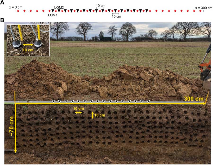 Figure 8 - A Schematics of experimental set-up. In total 16 instruments were used (black inverted triangles). The red stars show the hammer strike location. B Photograph of the detailed soil sampling which was conducted right beneath the seismic experiments (black inverted triangles with white rim show approximate location of the geophones). Horizontal yellow line measures the extend of the trench (300 cm), vertical yellow line measures the depth of the trench. In total 210 soil samples were taken, with approximately 10 cm spacing between them, and analysed for each experimental treatment. Inlay shows zoom of LOM instruments during experiment. Source: Tsekhmistrenko et al. (2025) - https://iopscience.iop.org/article/10.1088/2515-7620/ae1d27/meta#ercae1d27s4